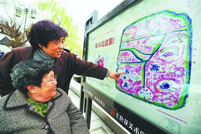 昨天,市民滿女士推著85歲的母親在曲水亭街北首瀏覽一幅充滿童趣的“泉水景觀導(dǎo)游圖”。據(jù)了解,這幅導(dǎo)游圖出自一名孩子之手,它用兒童獨特的視角描繪出曲水亭街周邊十余處泉水景點的方位,并配以富有童趣的插畫,讓游客耳目一新。 (記者 崔健 攝)