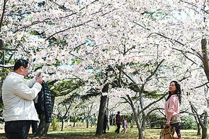 本報訊 中山公園的櫻花昨日終于進入盛花期,借著明媚的春光,6萬名游客入園賞花。