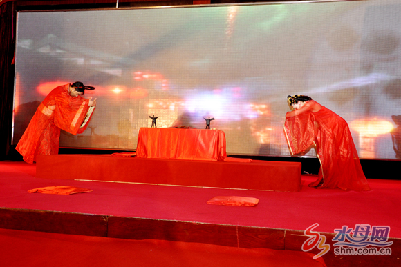 漢式婚禮是新郎新娘提出的要求,大紅色是婚禮的主基調,常規的鮮花路引變成了火紅的大燈籠。專業模特扮演的漢代侍女款步走來,將幾個有胳膊粗的蠟燭燭臺一一點亮。婚慶典禮由少女現場彈奏古箏開場,作為背景墻的LED大屏幕放的是那首“我欲與君相知,長命無絕衰……”侍女挑燭燈出場,引出新娘。新郎在臺上出場,向臺下行漢代標準禮。回到臺上,新人行標準的合巹之禮,整個禮儀過程在25分鐘左右,臺下觀眾一片安靜,屏氣欣賞。