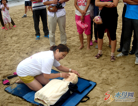 “海中救人得有技術(shù),首先救援時(shí)不能與落水者面對(duì)面救助,不然連自己也得搭進(jìn)去。”救援隊(duì)隊(duì)員在現(xiàn)場進(jìn)行了演示,一位志愿者進(jìn)入海中呼救,另一位志愿者迅速游近,轉(zhuǎn)到其身后,用手托住腋下,并將落水者舉起頂在背部。上岸后,將落水者頭向下背在肩上,平放在地面后,馬上實(shí)施心肺復(fù)蘇救助。