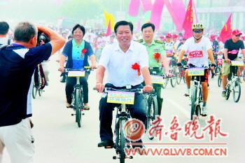 8月8日上午,2012“全民健身日”聊城市慶祝活動啟動,同時啟動“環城騎行”活動倡導全民健身。上午9時許,隨著市長林峰海宣布騎行活動開始并鳴槍,有上千市民參與的“環城騎行”活動正式開始。圖為林峰海帶領“車隊”出發。