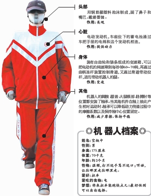 看到這“人模人樣”的機器能行走,路邊的人央求郭恩成拉開了機器人外套的拉鏈。只見機器人身體里有一塊有不少圓孔的鋼板,往里還能看到齒輪和上了油的黑色鏈條。在對應人體心臟和肝臟的位置有一個東西,郭恩成說這是個電動發動機,車座位下面的蓄電池通過車把手里的電線和這個發動機相連,為機器人提供動力。齒輪和鏈條是變速箱的一部分,電動機的轉速每秒鐘約1000轉。通過變速箱把轉速降到每秒鐘60~70轉,再通過曲柄連桿裝置控制滑道,又通過滑道帶動拉桿,機器人的腿就被拉桿帶動著走起來了。