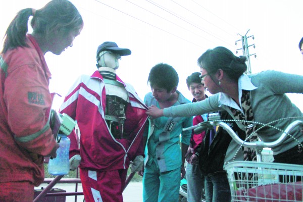 只見這個機器人身著校服、腳穿帆布鞋、頭戴太陽帽和墨鏡。每走一步,機器人的胳膊都向上抬一下,然后腿部膝關節打彎,邁步向前。后面車上拉的正是這個機器人的制造者——56歲的大皂孫家村村民郭恩成。拉車的機器人酷似真人,雖然手還沒有長出來,手腕被鋼絲和布條固定在兩輪車的車把上,但是頭、身子、胳膊、腿樣樣都有。