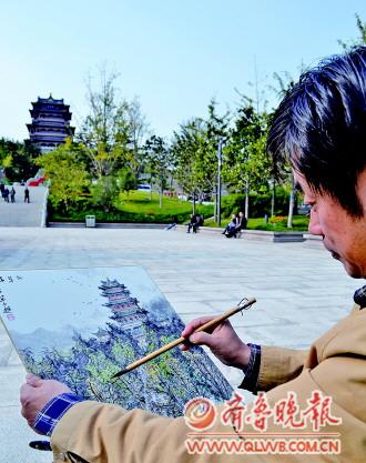 29日,水墨畫愛好者單先生為環(huán)翠樓作“畫像”。本報(bào)見習(xí)記者 趙輝 攝影報(bào)道