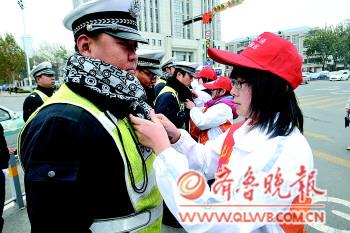“交警和交通協(xié)管員每天站在寒風(fēng)中,戴條圍脖可以保暖。”25日,來自山建工的大學(xué)生志愿者為歷下區(qū)的交警和交通協(xié)管員戴上了50條愛心圍脖。這些圍脖是大學(xué)生志愿者通過做兼職賺得1500元購買的。