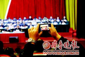 1月10日上午,市政協(xié)十二次二屆會議勝利閉幕,一名政協(xié)委員用手機拍攝下閉幕一刻留作紀念。