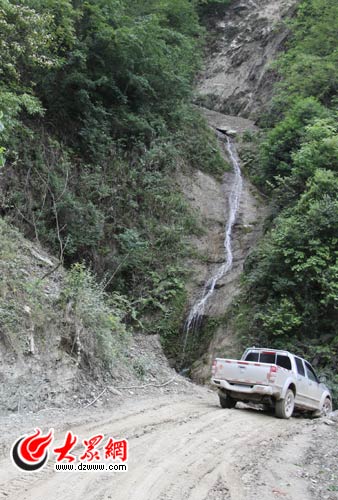 從北川老縣城西鄰,新開辟的山路順著堰塞湖一路向山里進發(fā),這條新近才通車的道路,盡管相比較地震過后繞道江油的運輸線路路程大大縮短,但路況的險惡程度甚至超越擂禹路。地震帶來的山體滑坡致使堰塞湖兩側山體陡如刀削,而狹窄的道路如同在懸崖上切出,多數(shù)情況下僅容一輛車通過,雨后的山路更是松軟泥濘。據(jù)當?shù)厝私榻B,已經(jīng)發(fā)生過多起汽車墜入崖下堰塞湖的交通事故。