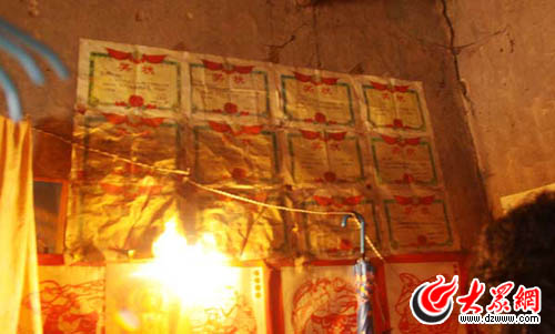在屋子的一角,一塊布簾圍著一張小床和一個(gè)小方桌,這就是王艷的“個(gè)人空間”,灰暗的燈光下,記者看到,桌子和床上的被褥都很破舊,但床上方的墻上卻貼滿了獎(jiǎng)狀。“這都是王艷在學(xué)校得的”,王艷的爺爺說,孩子的成績好是他最大的欣慰,“就是砸鍋賣鐵,就是貸款,我也要供孩子上大學(xué)。”