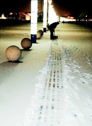 15日晚,煙臺濱海廣場上的值班人員在清理盲道上的積雪。郭建政攝