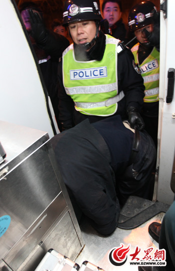 兩位頭戴鋼盔的民警試圖用力將其架進(jìn)車倉(cāng),而該名男子卻一直蒙頭遮面,如一塊泥巴粘在車門口附近,兩 位民警再怎么用力也無(wú)濟(jì)于事。經(jīng)民警苦口勸解,該男子方同意接受了血液檢測(cè)。