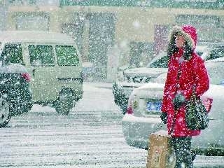 29日,煙臺街頭,一位女士正在雪中等出租車。 本報記者 張琪 攝