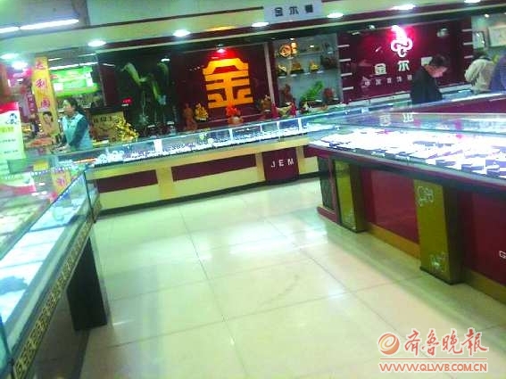 晚上8時左右,記者來到寧陽縣萬達百貨商場一樓金爾曼金飾品專柜,看到工作人員正在向顧客介紹飾品情況,但商場中還有很多人議論著下午發生的持“槍”搶劫的事情。