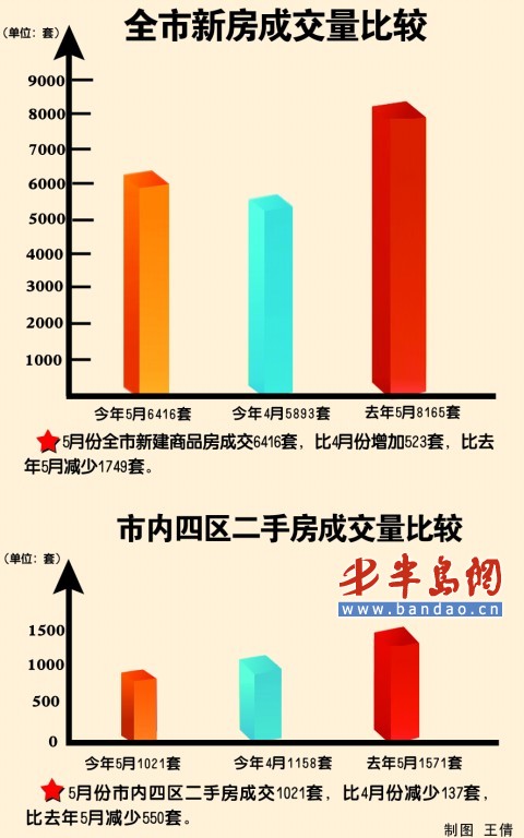 6月1日,青島市國土資源和房屋管理局公布了今年5月份青島房地產市場成交數據,全市新建商品住宅成交6416套 ,較4月份增加了523套 ,增幅為8% ;但市內四區的簽約量卻繼續滑落 ,僅簽約1353套 ,環比跌幅多達14%。