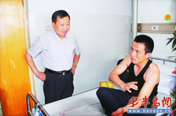 膠南市公安局黨委書記、局長孔繁霈到醫(yī)院探望劉闖華(右一)。