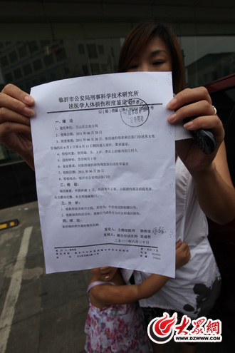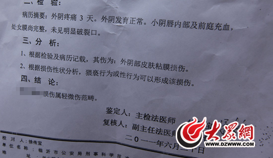 7月13日,朱女士向大眾網記者講述了事情經過。她向記者出示了孩子入托時的發票,并出具了法醫鑒定結果。白紙黑字醒目地寫著:“外陰部皮膚粘膜損傷;根據損傷性狀分析,猥褻行為或性行為可以形成該損傷!甭淇钍牵号R沂市公安局刑事科學技術研究所。