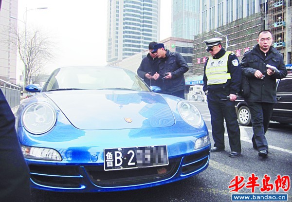 3月3日上午10時(shí)許 ,執(zhí)勤民警在山東路巡邏時(shí),發(fā)現(xiàn)路邊停著一輛只有前牌的黑色桑塔納轎車(chē)。經(jīng)過(guò)查詢(xún)發(fā)現(xiàn),該車(chē)果然是“張冠李戴”,冒用了江蘇一輛綠色吉普車(chē)的牌照。由于沒(méi)有找到桑塔納司機(jī),民警決定暫時(shí)先把違法車(chē)輛拖走。就在此時(shí),一輛途經(jīng)此處的藍(lán)色保時(shí)捷跑車(chē)引起了執(zhí)勤民警的注意。“這輛車(chē)的車(chē)牌也有問(wèn)題。”市南交警大隊(duì)香港西路中隊(duì)副中隊(duì)長(zhǎng)李國(guó)輝告訴記者,經(jīng)過(guò)前后比對(duì)發(fā)現(xiàn),這輛保時(shí)捷的后牌是偽造的。由于保時(shí)捷的駕駛員是一位烏克蘭籍女士,經(jīng)過(guò)簡(jiǎn)單交流,記者得知,這輛車(chē)的后牌確實(shí)被換過(guò),但她同時(shí)表示因?yàn)椴皇亲约核鶠椋膊涣私庠斍椤?/P>