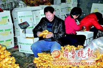 郭慶剛忙活著把成堆的姜裝箱。本報記者徐潔攝