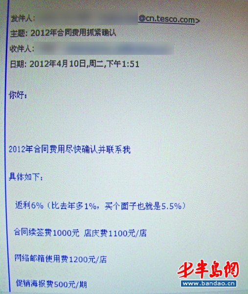 王平說,他是4月10日收到樂購超市提供的新一年供貨合同的,合同中除了要王平支配500元的促銷海報費、1200元的網絡郵箱使用費外,返利費用比去年增加一個百分點,為6%,新增了1100元錢店慶費用!斑@些費用只在與供應商的合同中有體現,開發票時都歸到服務費一項”。