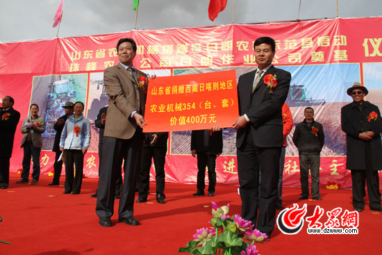 日喀則地委副書記、行署專員許雪光(右)代表日喀則地委、行署接受山東省400萬元農機物資捐贈。