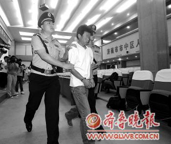 25日,一名被告人戴著手銬被押往濟南市看守所。本報記者張中攝