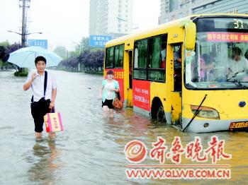 8日上午,臨沂37路公交車在嚴(yán)重積水的馬路上勉強(qiáng)行駛。 本報(bào)記者 王倩 攝