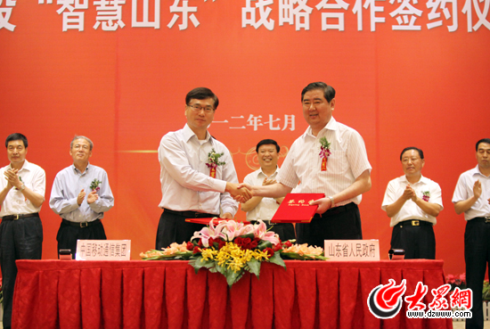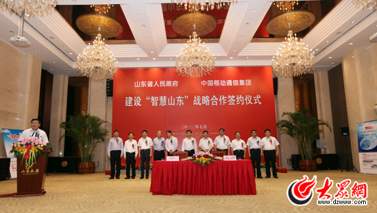 大眾網(wǎng)濟南7月9日訊(記者 盛堃 劉國君)今天,山東省人民政府與中國移動通信集團公司建設(shè)“智慧山東”戰(zhàn)略合作協(xié)議簽字儀式在濟南舉行。省委副書記、省長姜大明,中國移動董事長、黨組書記奚國華出席簽約儀式并致辭。省委副書記、副省長王軍民與中國移動總裁李躍分別代表雙方簽署了戰(zhàn)略合作協(xié)議。根據(jù)協(xié)議,“十二五”期間,中國移動將投入500億元用于山東“智慧城市”群的建設(shè)。