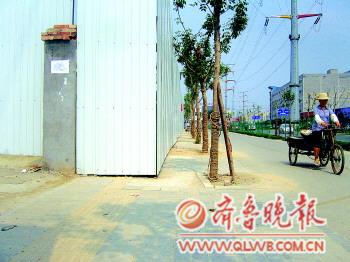 ◤銀白色廣告墻和行道樹完全占據了人行道。見習記者張亞楠攝