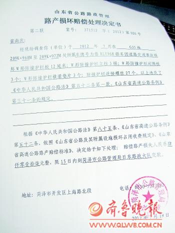 ▲日東(日南)高速公路菏澤路政管理大隊給苗先生開具的賠償處理決定書。