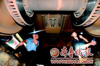 ▲檢測車輛的制動裝置時,兩名工人蹲在車輛兩側“擦、望、敲、聽”。