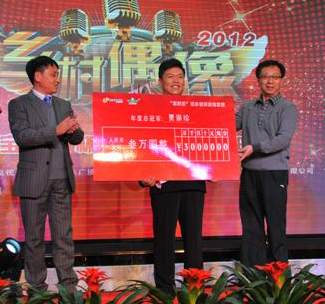 賈崇珍在2012年11月26日頒獎晚會舞臺上領(lǐng)到獎金