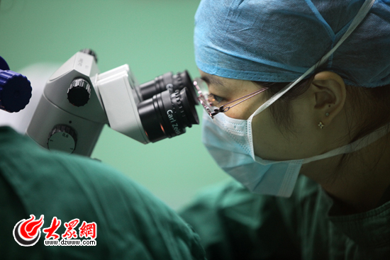 今天上午9:30,手術開始,手術室內兩臺手術同時進行。大眾網記者隔著玻璃看到,在完成最后一次消毒沖洗后,患者被扶到手術臺上。頭部包好治療巾后,兩名主刀醫生相互配合同時為一名患者做手術,醫生使用一臺大型的電子觀察儀器來精確查看患者眼部的細微變化。手術進行順利,有的患者的手術僅用10分鐘左右就完成了;颊咦鐾晔中g后,被護士攙扶著回到病房,并向患者和家屬交代一周內在飲食、起臥等方面需要注意的事項。