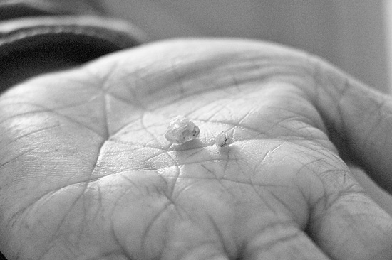“那是2010年剛開春,老伴突然間頭疼,我沒太在意,以為她精神病復發了。但她老是說眼睛里磨得厲害,我翻開她的眼皮,竟從眼皮和眼球之間摳出一塊玉米粒大的半透明石子,可嚇壞我了。此后一段時間,老伴的頭疼一直沒好轉,眼中的石子有時一天能摳出三四塊,有時一兩天才摳出一塊。”梁新春回憶說。
