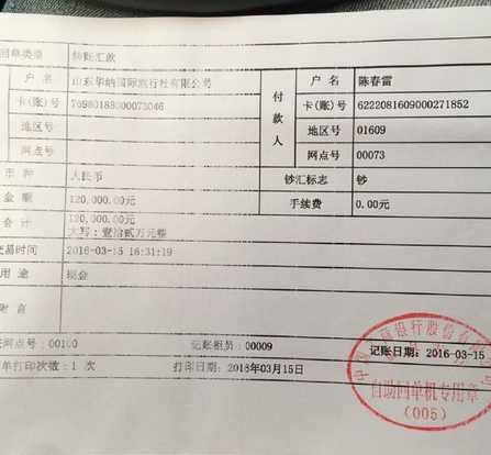 有的消費者還在網(wǎng)上貼出了一張向山東華納國際旅行社有限公司轉(zhuǎn)賬匯款12萬元的單據(jù)。