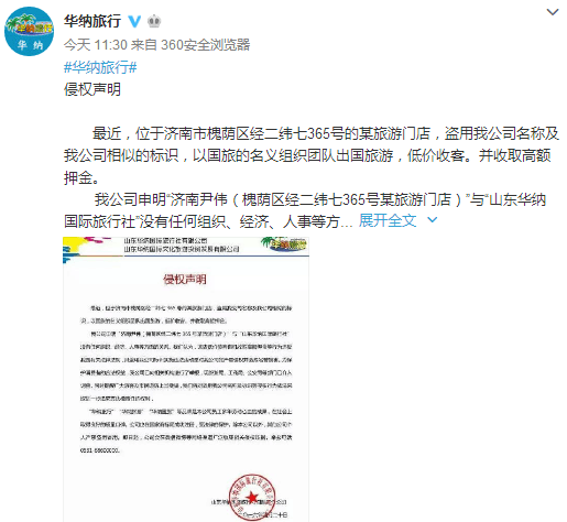 對此,今天上午11點30分,山東華納國際旅行社有限公司通過官方微博回應(yīng)稱尹偉所為系盜用該公司名稱及相似的標(biāo)識,與其沒有任何組織、經(jīng)濟、人事方面的關(guān)系。同時,中國國旅(山東)國際旅行社有關(guān)工作人員表示,網(wǎng)上貼出的照片中涉及該公司的公章是尹偉假冒的,該公司前幾天在發(fā)現(xiàn)尹偉私刻該公司的公章后,已向公安機關(guān)報案。