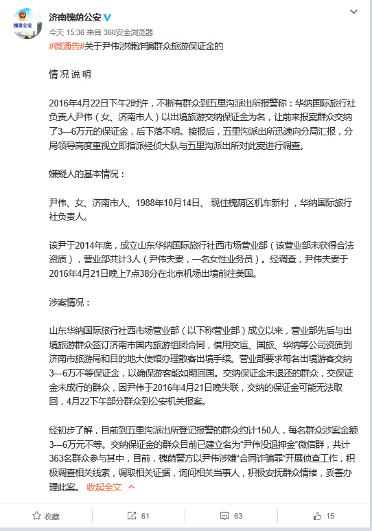 山東華納國際旅行社西市場營業(yè)部(以下稱營業(yè)部)成立以來,營業(yè)部先后與出境旅游群眾簽訂濟南市國內(nèi)旅游組團合同,借用交運、國旅、華納等公司資質(zhì)到濟南市旅游局和目的地大使館辦理散客出境手續(xù)。營業(yè)部要求每名出境游客交納3—6萬不等保證金,以確保游客能如期回國。交納保證金未退還的群眾,交保證金未成行的群眾,因尹偉于2016年4月21日晚失聯(lián),交納的保證金可能無法取回,4月22下午部分群眾到公安機關(guān)報案。經(jīng)初步了解,目前到五里溝派出所登記報警的群眾約計150人,每名群眾涉案金額3---6萬元不等。交納保證金的群眾目前已建立名為“尹偉沒退押金”微信群,共計363名群眾參與其中,目前,槐蔭警方以尹偉涉嫌“合同詐騙罪”開展偵查工作,積極調(diào)查相關(guān)線索,調(diào)取相關(guān)證據(jù),詢問相關(guān)當(dāng)事人,積極安撫群眾情緒,妥善辦理此案。