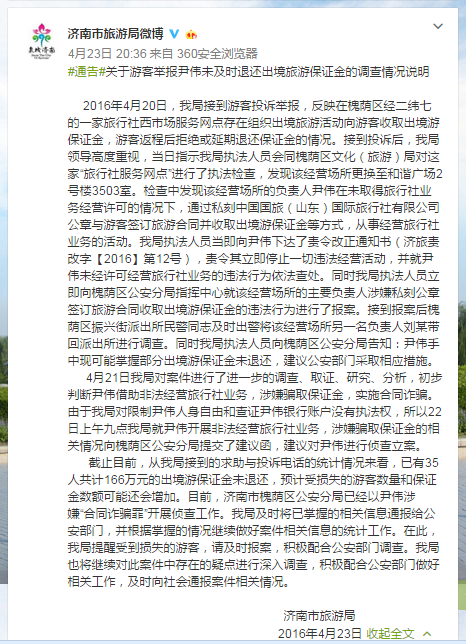23日晚,濟南市旅游局通過其官微發布了“關于游客舉報尹偉未及時退還出境旅游保證金的調查情況說明”稱,2016年4月20日,該局接到游客投訴舉報,反映在槐蔭區經二緯七的一家旅行社西市場服務網點存在組織出境旅游活動向游客收取出境游保證金,游客返程后拒絕或延期退還保證金的情況。接到投訴后,該局領導高度重視,當日指示該局執法人員會同槐蔭區文化(旅游)局對這家“旅行社服務網點”進行了執法檢查,發現該經營場所更換至和諧廣場2號樓3503室。檢查中發現該經營場所的負責人尹偉在未取得旅行社業務經營許可的情況下,通過私刻中國國旅(山東)國際旅行社有限公司公章與游客簽訂旅游合同并收取出境游保證金等方式,從事經營旅行社業務的活動。