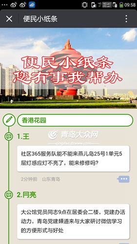 “這些信息一旦上傳到‘便民紙條’中,不僅居民和我們可以看到,微市南平臺上97家自媒體以及全區(qū)居民都可以看到,我們解決的怎么樣,一目了然。”董作蘭說。大眾網(wǎng)記者了解到,在市南各個社區(qū)的微信公號上,都有類似小紙條解決民意訴求的功能。