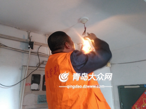 志愿服務隊員辛悅鋼在修理樓道感應燈。