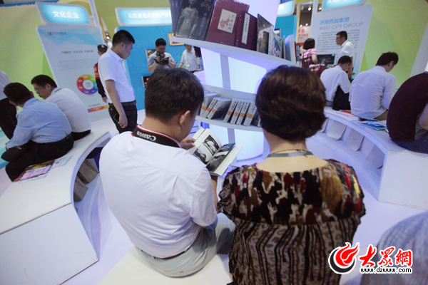 魯版圖書、精品魯劇、孔子文化產(chǎn)品、山東各地特色文化產(chǎn)品等吸引了眾多觀眾。圖為兩位觀眾坐在展區(qū)休息處認(rèn)真閱讀魯版圖書。記者 馬俊驥 攝