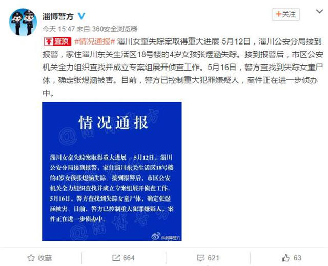 山東省淄博市公安局官方微博@淄博警方2016年5月16日15時47分許發布消息稱:淄川女童失蹤案取得重大進展 5月12日,淄川公安分局接到報警,家住淄川東關生活區18號樓的4歲女孩張煜涵失蹤。接到報警后,市區公安機關全力組織查找并成立專案組展開偵查工作。5月16日,警方查找到失蹤女童尸體,確定張煜涵被害。目前,警方已控制重大犯罪嫌疑人,案件正在進一步偵辦中。