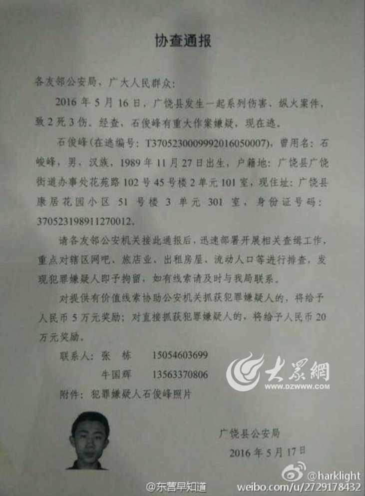 17日早上,廣饒公安發布協查通報,經查,石俊峰有重大作案嫌疑,現在逃。根據通報,警方對提供有價值線索協助公安機關抓獲犯罪嫌疑人的,將給予人民幣5萬元獎勵;對直接抓獲犯罪嫌疑人的,將給與人民幣20萬元獎勵。