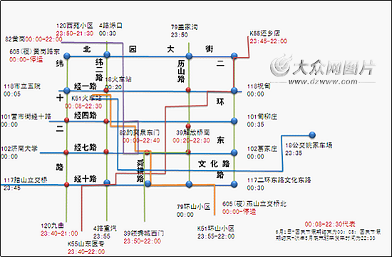 6月1日起,北園大街、經一路、經四路、經七路、文化路、經十路、二環東路、歷山路、舜耕路、緯二路和緯十二路走廊上共13條公交線路運行至零時,將構成 “井”字型和“米”字型夜間服務網絡。市民可在大觀園、全福立交橋、緯十二路與經十路、無影山中路與黃崗路、燕山立交橋5個城市重要節點進行換乘銜接。