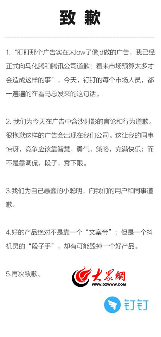 這是咋回事?原來今年4月以來,阿里旗下辦公軟件“釘釘”以大幅藍綠廣告的形式在騰訊總部樓下的地鐵“刷墻”,暗示用微信溝通工作效率低下,不如用釘釘。5月30日,馬云在對騰訊和馬化騰的道歉信中提到:“‘盯盯’那個廣告實在太 low了,像jd做的廣告,我已經正式向馬化騰和騰訊公司致歉!看來市場預算太多才會造成這樣的事。”