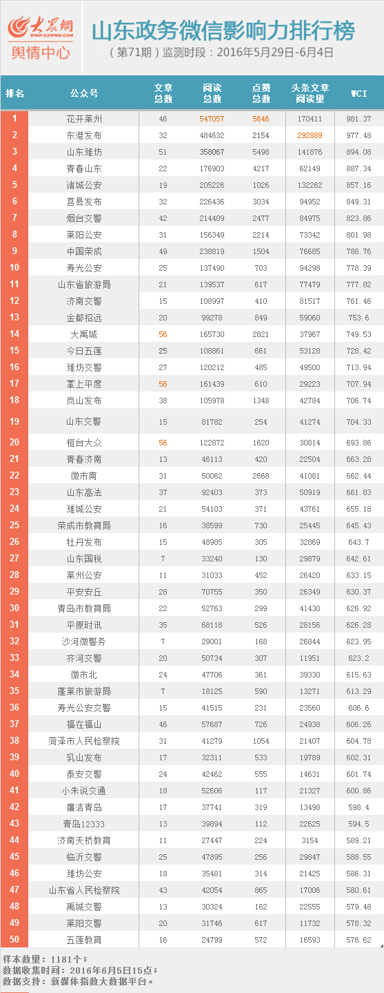 大眾網通過對山東省區縣級以上的政務微信進行數據統計,每周發布山東政務微信影響力排行榜。依據WCI(微信傳播指數)得分情況,每期推出我省政務微信前50強以及一周閱讀量最高的前10篇文章。