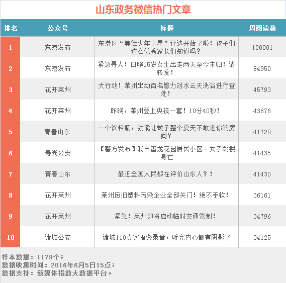 本期熱門文章榜第一名,由“東港發布”發布的《東港區“美德少年之星”評選開始了啦!孩子們這么優秀家長們知道嗎?》獲得,教育從娃娃抓起,立德從童年開始,此文章主題與社會主義核心價值觀相契合,輕松斬獲10萬+的周閱讀量,在弘揚社會主義核心價值觀的同時還能有如此大的閱讀量,表現真是杠杠噠!“東港發布”的另一篇文章《緊急尋人!日照15歲女生出走兩天至今未歸!請轉發!》的緊隨其后,獲得了本期熱文榜第二名。承包了本期一二名的“東港發布”簡直要逆天!此外,“花開萊州”共有四篇文章進入榜單十強,其中《大行動!萊州出動百名警力對水云天洗浴進行查處!》以45793的周閱讀數獲得了熱文榜第三名,總體成績相當漂亮,表現同樣不俗!
