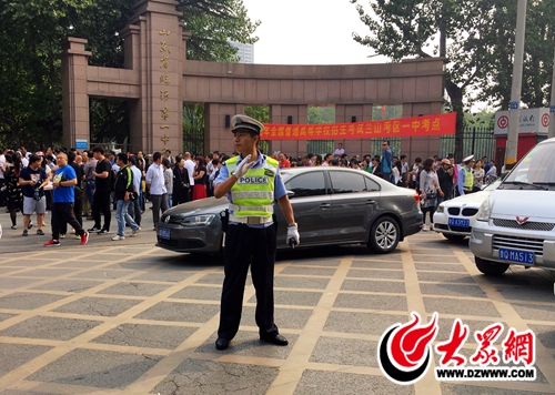 7日上午7時許,大眾網記者在臨沂一中考點門口看到,臨沂市公安交警支隊直屬一大隊副大隊長趙偉已經在路口執勤,疏導來往車輛,保障道路暢通,開始了一天緊張又辛苦的工作。今年他的女兒也參加高考,但是他卻依舊選擇堅守崗位。