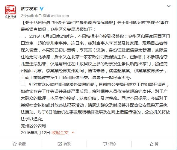 關于8日晚所謂“搶孩子”事件最新調查情況,兗州區公安局通報如下:
