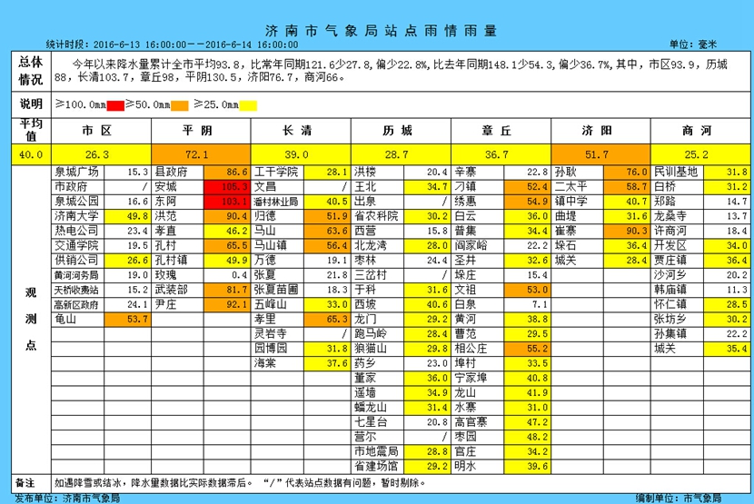 截至6月14日下午16時(shí),濟(jì)南今年以來(lái)降水量累計(jì)全市平均93.8毫米,其中最近24小時(shí)降水量全市平均40毫米。