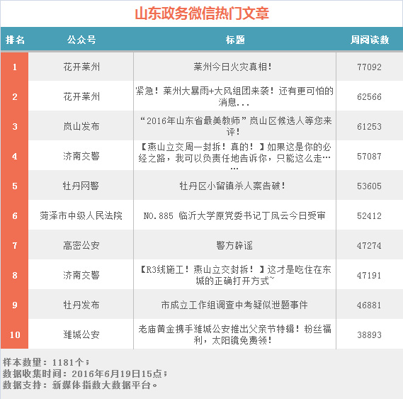 本期熱文榜中,“花開萊州”水與火兩篇文章斬獲一二名,其中《萊州今日火災真相!》憑借77092的周閱讀量奪得冠軍寶座!毒o急!萊州大暴雨+大風組團來襲!還有更可怕的消息...》取得熱文榜第二名,這篇文章的長標題通過當下較為流行的表達方式傳達了居民需要的硬性消息,軟硬結合,無疑更容易吸引粉絲的目光!皪股桨l布”發表的《“2016年山東省最美教師”嵐山區候選人等您來評!》取得熱文榜的第三名,表現同樣不錯。
