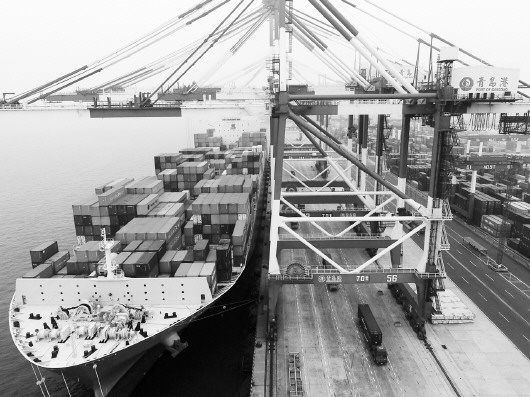 ▲青島前灣保稅港區集裝箱碼頭,來自釜山的貨輪正在作業。
